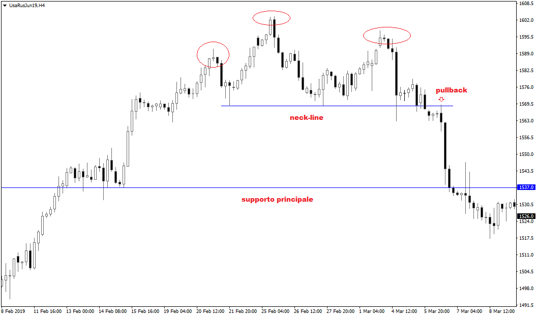 Il grafico mostrato in alto sul CFD dell’indice azionario americano Russell 2000 con scadenza giugno 2019, time frame a 4 ore, riassume quanto detto finora con un’immagine che come sempre vale più di mille parole… L’ingresso short sul pullback, magari con un ordine sell limit, avrebbe consentito la messa a punto di una transazione con rischio iniziale molto limitato e un potenziale rendimento altissimo considerando che la quotazione è scesa temporaneamente fin sotto il successivo supporto principale.