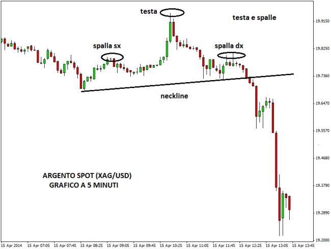 La violazione della neckline - a volte tracciata con una linea orizzontale a volte con una trendline – è un momento fondamentale per l’inversione definitiva del trend. Il breakout ribassista genera un segnale short molto significativo e può spingere i trader ad aprire posizioni corte in vista di nuovi cali. Il grafico in alto mostra un Testa e Spalle sull’argento spot (Xag/Usd), time frame a 5 minuti. Questo pattern può essere identificato su qualsiasi orizzonte temporale: nella fattispecie è un ottimo spunto operativo per gli scalper.