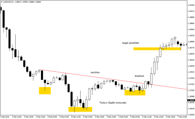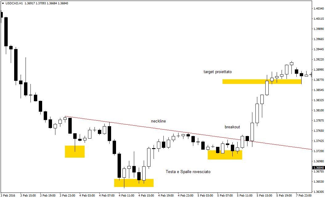 Il chart in alto si riferisce al tasso di cambio USD/CAD, il cosiddetto “Loonie”, su un time frame intraday a 60 minuti. Si può notare come il Testa e Spalle rovesciato identifichi un’ampia zona di accumulazione sui bottom di periodo. Il breakout esplosivo della neckline, ovvero della resistenza del pattern, dà il via a un consistente rally dei prezzi fin sopra 1,39 per un potenziale guadagno di circa 150 pip dal punto di ingresso.