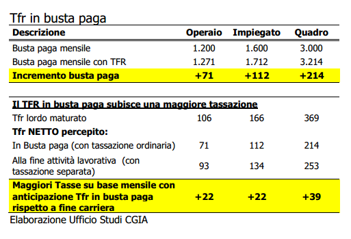 Nel caso in cui invece il dipendente aspettasse la conclusione della vita lavorativa, la tassazione sarebbe di gran lunga più favorevole. In base ai calcoli dell’Associazione artigiana e piccole imprese inoltre: