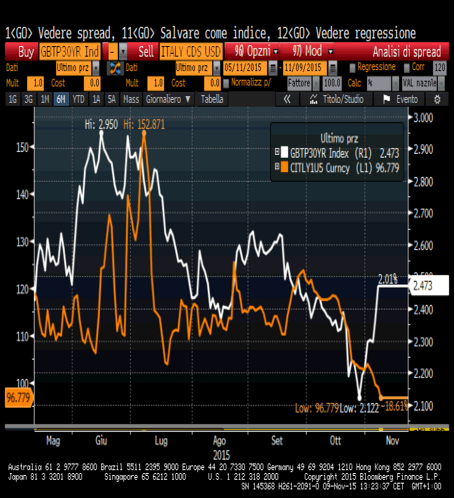 Fears of FED’s hike cannot influence italy’s BTP for long. So, I think this is a buy opportunity for BTP 1/9/2046 3.1/4 % which recently has gone down to 107 level (2.92% yield). I’m sure this bond easily will get back to 115 level (2.55% yield) when ECB will start to implement QE2 in January 2016.(see table below)