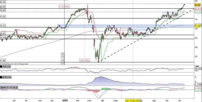 Breakout del titolo a rialzo e il prezzo segna il nuovo massimo storico. Possibile il raggiungimento di nuovi target positivi. Il primo livello potrebbe essere quota 87$.