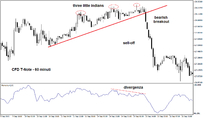 Un filtro molto valido è rappresentato dalla divergenza tra andamento dei prezzi e quello del momentum (settato a 14 periodi). Come si evince dal grafico in alto relativo al CFD sul T-Note americano a 10 anni, time frame a 60 minuti, il Three little indians è stato accompagnato da una divergenza ribassista prezzi-momentum e da un bearish breakout di una trendline. A un certo punto il segnale di trading short è apparso sempre più netto e in effetti ha anche dato ottimi risultati.