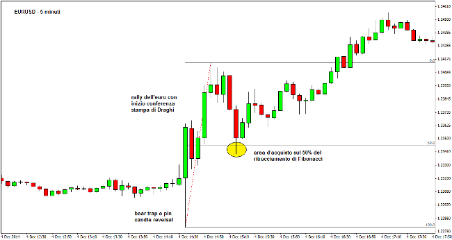 Possiamo visualizzare meglio le potenzialità di questo strumento con un esempio sul tasso di cambio euro/dollaro, time frame intraday a 5 minuti, sul quale è scattato un bellissimo rally dopo le dichiarazioni del governatore della BCE, Mario Draghi. Una volta constato la presenza di un trend rialzista emergente, si può inserire un ordine buy limit sul 50% del ritracciamento della gamba bullish. Il timing di entrata viene ottimizzato con successo e il rapporto rischio/rendimento della transazione long diventa assolutamente straordinario.
