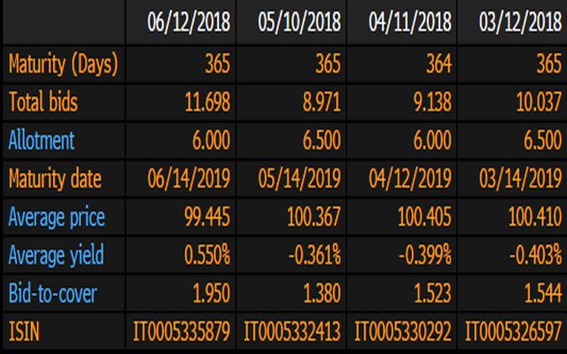 Il rendimento lordo di aggiudicazione è stato positivo e pari allo 0,55%. Il prezzo medio dell’emissione uguale a 99,445. Nelle precedenti aste dei BOT annuali di marzo, aprile e maggio il rendimento dei titoli è sempre stato negativo. Il rapporto di copertura dell’asta odierna è il più alto da inizio anno.