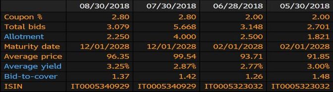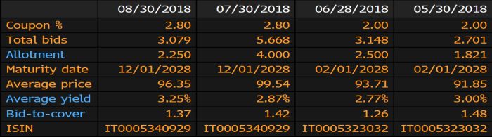 Il rendimento medio è stato del 3,25%, livello massimo da marzo 2014 e superiore rispetto al 2,87% dell’ultima emissione. Banca d’Italia ha comunicato che a fronte di una domanda pari a 3,079 miliardi di euro sono stati collocati tutti i 2,25 miliardi di euro offerti dal Tesoro, per un rapporto di copertura (proporzione tra ammontare richiesto e quantitativo offerto) pari al 1,37.