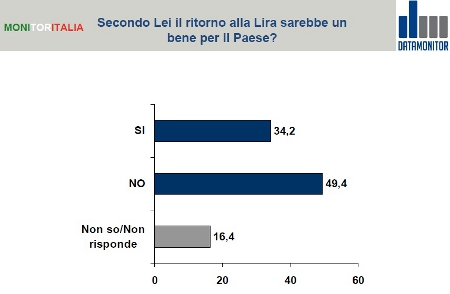 Al momento, gli Italiani non tornerebbero alla Lira. Il 36,9% del campione non tornerebbe alla Lira, mentre il 29.7% sarebbe favorevole ed il 33.4% è indeciso al riguardo.