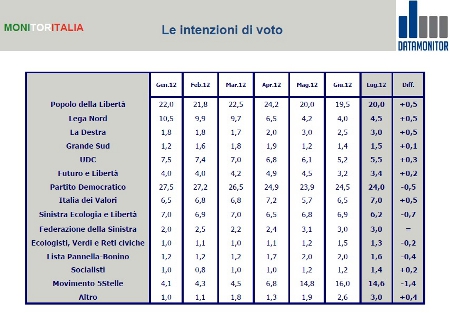 Riguardo alle intenzioni di voto, come sempre, l’Italia rimane divisa pressoché in due blocchi maggiori: PdL e PD (rispettivamente con il 20.0% e 24.0% del favore) con un Partito Democratico in flessione dello 0.5%. Anche il Movimento 5 stelle perde l’1.4% del consenso, rappresentando il 14.6% del favore degli elettori campione.