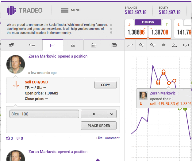 Tradeo si differenzia dagli altri broker forex perché è una delle prime piattaforme di trading ad aver completamente integrato la schermata di esecuzione degli ordini e la funzionalità del social trading nella stessa interfaccia. Prima di Tradeo, i trader presenti sui social network di trading dovevano passare dallo schermo per l’inserimento degli ordini allo schermo con le informazioni presenti sui social network.