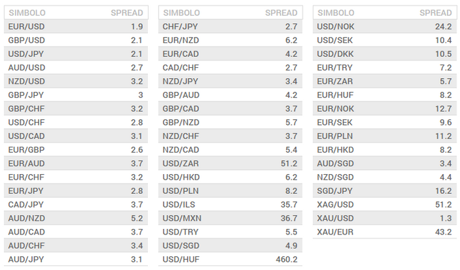 Lo spread minimo parte da 2.2 pips per le cross Forex principali e arriva ad un massimo di s 21.75 pips per le coppie più “esotiche”.
