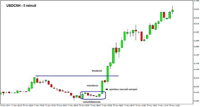 Per capire ancora una volta le potezialità di queste candele, andiamo a studiare un esempio grafico. In alto viene mostrato il chart a 5 minuti del tasso di cambio USDCNH, ovvero il rapporto di cambio tra il dollaro americano e lo yuan cinese (offshore). Si può notare che, a seguito della comparsa di una long marubozu, il mercato accelera con decisione verso l’alto mettendo a segno un serie di breakout che facilitano il rally nei minuti successivi.