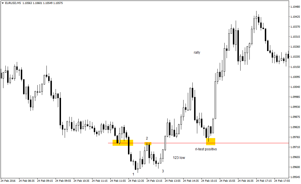Il grafico intraday mostrato in alto è riferito al tasso di cambio Euro/Dollaro, time frame a 5 minuti, dove si scorge la presenza di un netto 123 low con “doppio minimo” in area 1,0960 – 1,0955. La presenza di un minimo più alto rispetto al bottom principale è fondamentale. Poi il superamento del punto numero 2 fa attivare il setup. Si può notare anche il ri-test dell’ex resistenza posta al punto 2, ora supporto, e il successivo rally dei prezzi nel corso delle ore successive.
