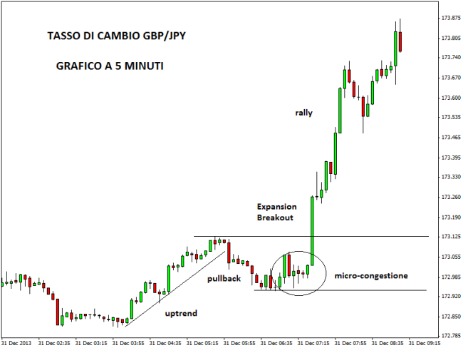 Se si osserva il grafico a 5 minuti del tasso di cambio Gbp/Jpy, ovvero sterlina britannica su yen giapponese, si può notare che l’expansion breakout rialzista si forma in una fasci oraria particolarmente importante, ovvero quando prendono il via le contrattazioni sui mercati europei. Il boom dei prezzi è assolutamente significativo, anche perché avviene dopo una fase laterale e di bassa volatilità. Nei minuti successivi i prezzi saliranno molto, offrendo una ghiotta opportunità di scalping.