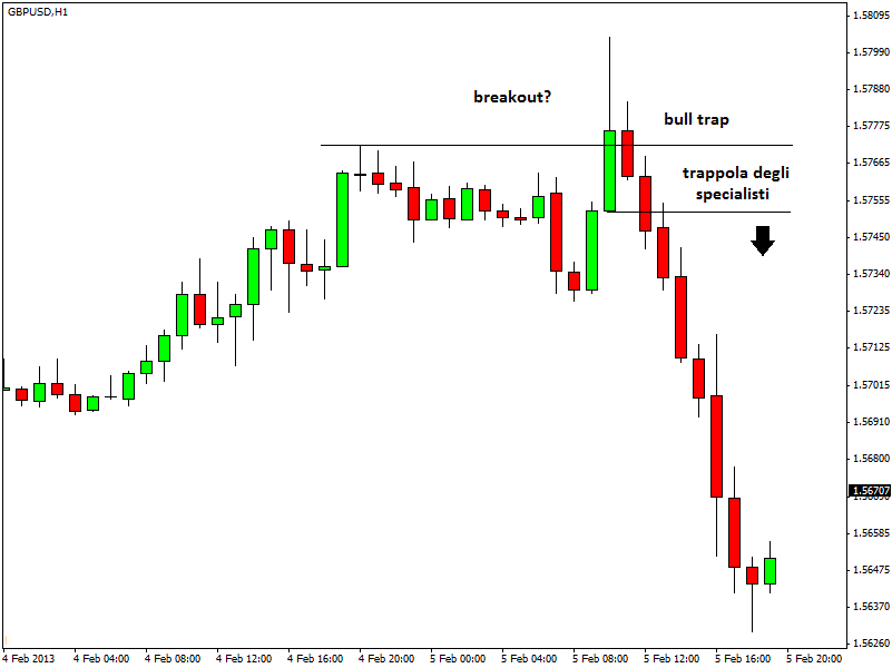 La trappola degli specialisti è una classica manovra di inganno messa a punto dalle "mani forti", ovvero i cosiddetti large traders, ai danni dei piccoli trader privati. Equivale a un falso breakout e funziona meglio quando avviene un breakout intraday nella direzione opposta al trend principale mostrato su base giornaliera.