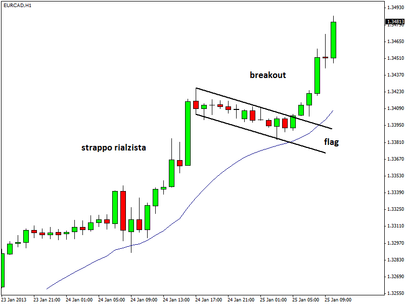 Una strategia di continuazione del trend molto semplice da attuare il breakout di una flag ("bandiera"), che tra l’altro è una figura grafica elementare presentata nella dottrina tradizionale dell’analisi tecnica di base. La cosa più importante per attuare questa strategia è la formazione di uno strappo dei prezzi, che sia particolarmente rilevante.
