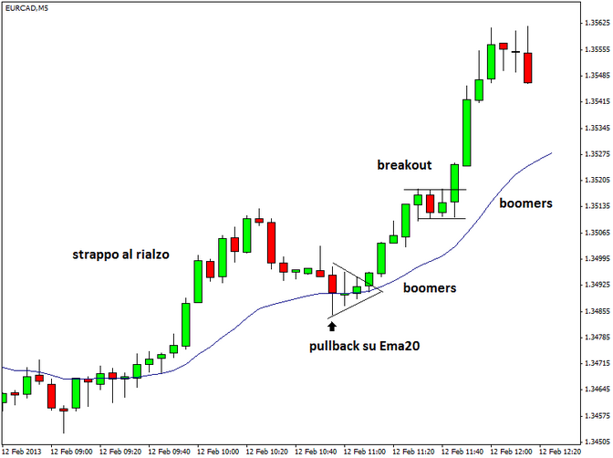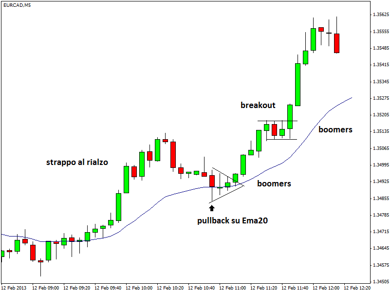 Nel case study mostrato sul tasso di cambio euro/dollaro canadese (EUR/CAD), time frame a 5 minuti, si può notare come si formi un boomers in ben due occasioni a seguito dello strappo bullish dei prezzi. Nel primo caso il "triangolino dinamite" compare dopo un pullback sulla Ema20; nel secondo caso si forma dopo la rottura di una micro-resistenza.
