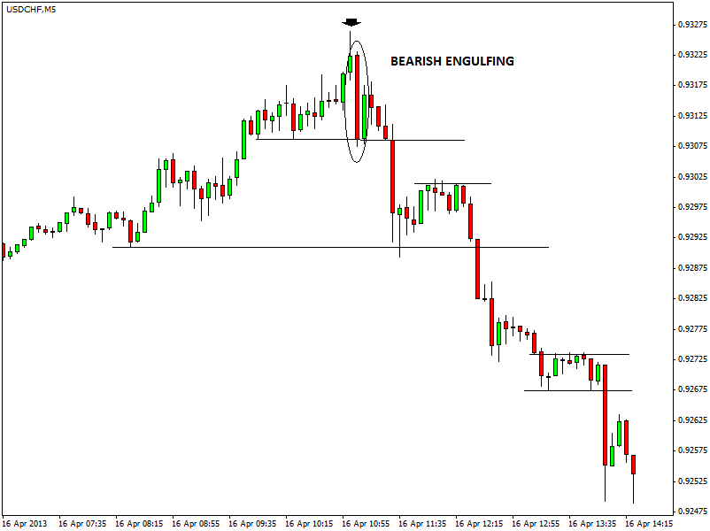 L’engulfing pattern è uno dei segnali generati dalla candlestick analysis più efficaci in assoluto. E’ un pattern di inversione del trend, che funziona molto bene su qualsiasi time frame. Consente di entrare in posizione con un rischio molto contenuto. Oggi andiamo a studiare un esempio sul tasso di cambio USD/CHF, ovvero dollaro americano su franco svizzero. Il time frame analizzato è il 5 minuti.