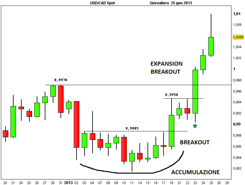 L’esempio riferito al tasso di cambio USD/CAD, grafico giornaliero, mostra un expansion breakout che si forma dopo un primo strappo dei prezzi avvenuto a seguito del superamento di una fase di congestione sui minimi di periodo. L’expansion breakout consente al trader di breve termine di intervenire al rialzo per puntare a un nuovo apprezzamento dei prezzi nei giorni successivi.