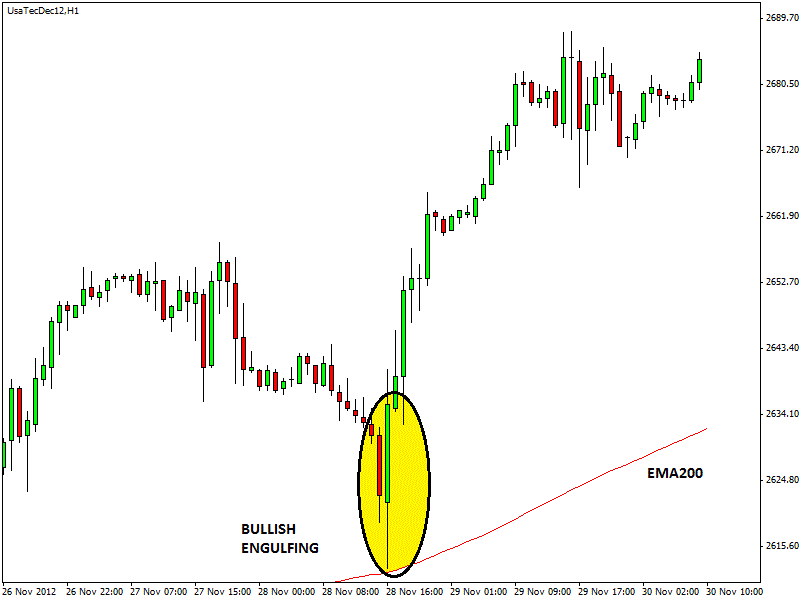 Nel case study di oggi, relativo al grafico a 60 minuti del CFD UsaTecDec12 dell’indice azionario Nasdaq, si può notare la formazione di un bullish engulfing sul grafico orario, tra l’altro sulla media mobile esponenziale a 200 periodi (EMA200). E’ un pattern di inversione del trend molto efficace, che quasi sempre tende a offrire buoni guadagni. In questo caso si poteva anche ipotizzare una strategia di trading multiday.