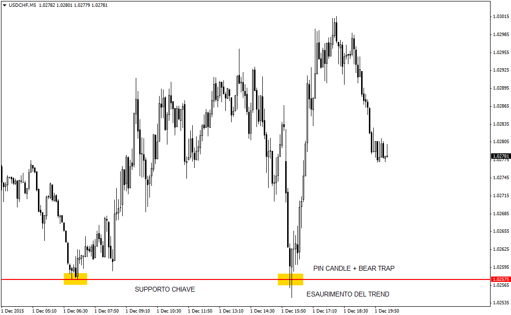 Il grafico mostrato in alto sul tasso di cambio USD/CHF, time frame a 5 minuti, mette in evidenza una classica bear trap su una zona di supporto intraday. Qui si forma una lunga coda inferiore, a testimoniare la presenza di un esaurimento della spinta dei venditori. Il setup pattern in questione è la pin candle, molto nota ai trader che lavorano con la price action. L’inversione è repentina e i prezzi salgono di almeno 40 pip in poco più di un’ora.