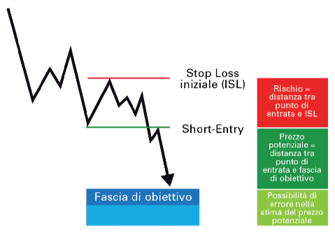 Mentre il rischio di un trade può essere chiaramente determinato mediante l’uso di uno stop loss ben determinato (vedere scritta rossa sul lato destro), questo non è altrettanto chiaramente possibile riguardo alle previste variazioni delle quotazioni (vedere scritta verde). Un obiettivo (vedere scritta blu), può essere praticamente disegnato in modo casuale nel grafico dei prezzi, e portare a gravi errori di valutazione per quanto riguarda le possibilità di guadagno che ci si può realisticamente aspettare da un trade.