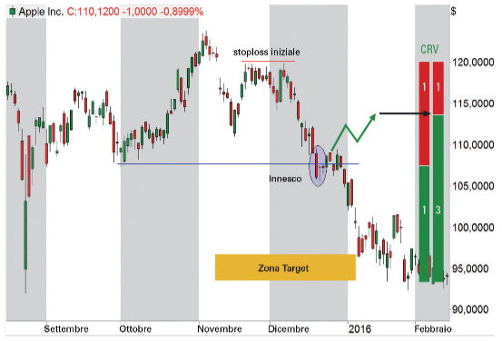 In questo esempio, se volete aspettare un prezzo di entrata migliore, restate a mani vuote. Dopo l’apertura i prezzi delle azioni Apple corrono verso il basso su un percorso diretto verso la fascia di obiettivo. La riga a destra mostra come il RRR sarebbe migliorato in modo significativo da 1 (entrata diretta) a 3 (entrata in ritardo), ma non è mai stato tradato.