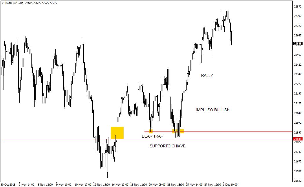 Il grafico in alto è basato sul time frame intraday a 60 minuti. Mostra la presenza di un gap up, che nel giro di qualche giorno diventa un supporto chiave del mercato. L’area di prezzo intorno a 21.850 punti attrae un gran numero di compratori, anche grazie alla presenza di una bear trap scaturita da un falso breakout di un supporto intermedio. L’inversione rialzista è servita e la quotazione salirà con decisione nei giorni successivi.