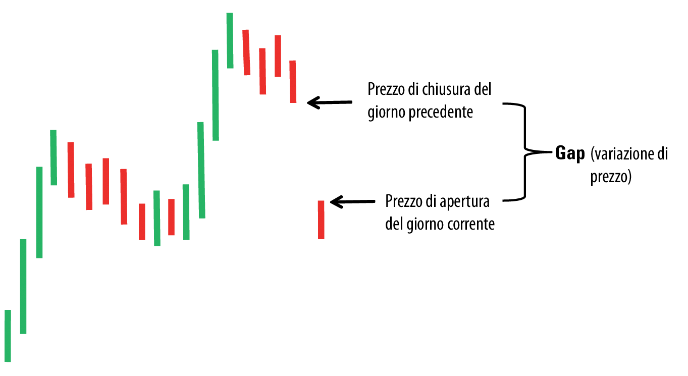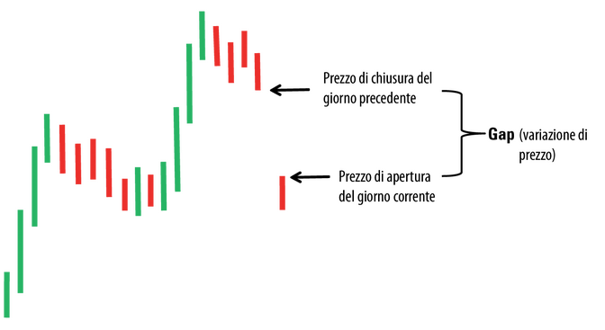Un gap è una significativa variazione di prezzo tra il prezzo di chiusura di un giorno e il prezzo di apertura di quello successivo (figura 1). In linea di principio, questi gap possono presentarsi in tutti i beni che non vengano scambiati 24 ore al giorno, senza interruzioni.