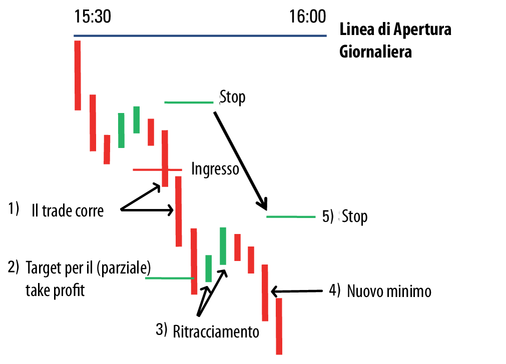 Non apriamo il nostro trade finché i titoli non hanno un nuovo minimo (al contrario per i trade long). In questo modo avremo un’ulteriore conferma dell’alta probabilità che il mercato si muoverà ancora in questa direzione. Cercheremo di prendere posizione prima che gli altri partecipanti al mercato vendano ulteriormente. In questo caso, da un lato potrebbe trattarsi di investitori che vogliono venere rapidamente perché temono che i prezzi scenderanno ancora. Dall’altro lato potrebbero essere trader che avevano puntato sulla salita dei prezzi dopo il gap e adesso sono costretti a chiudere le proprie posizioni perché capiscono di avere sbagliato. Nel caso dei gruppi a due interessi, quando i prezzi scendono al di sotto del minimo della giornata