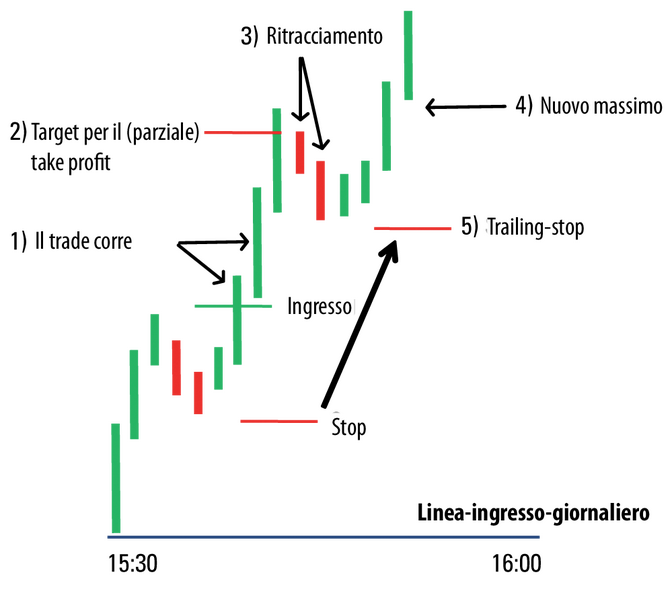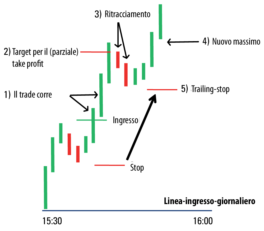 | Trailing stop | Opzionale, per esempio sui massimi temporanei (short) quando si forma un nuovo minimo (long reverse) |