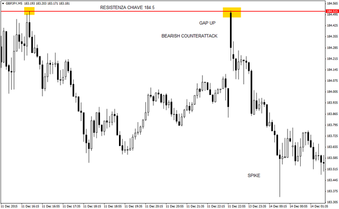 Gli ampi gap in apertura sono spesso occasioni di trading potenzialmente molto profittevoli e in grado di generare notevoli inversioni del trend nel breve periodo. Il gap è una condizione d’eccesso, che viene a crearsi tra la chiusura del giorno prima e la successiva apertura della seduta seguente. Nel case study mostrato oggi sul tasso di cambio Sterlina/Yen si può notare un ampio gap up, subito seguito dal cosiddetto “bearish counterattack” identificato dalla candlestick analysis.
