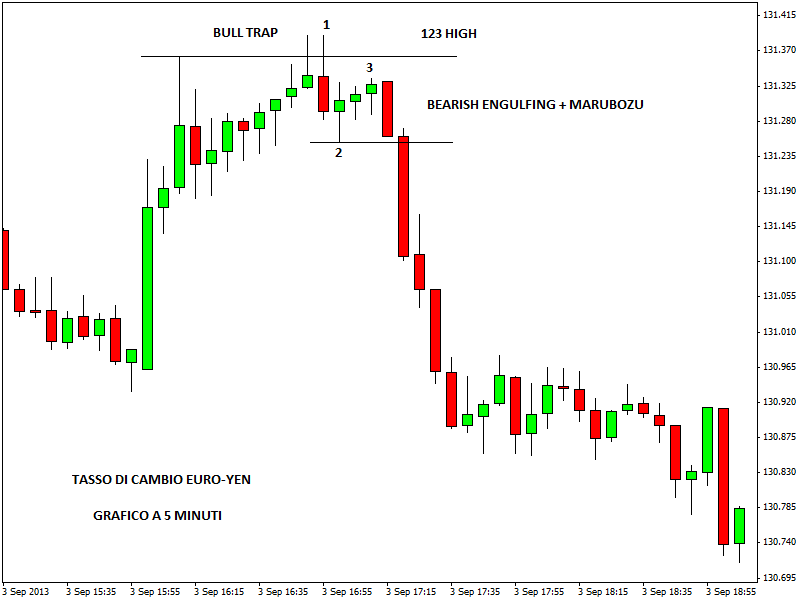 Il grafico a 5 minuti del cross euro-yen mostra inizialmente un’esplosione al rialzo dei prezzi, che però perde velocemente momentum. La risalita diventa problematica a contatto con una zona di micro-resistenza, dove si concretizza una classica bull trap, ovvero una trappola per tori (i compratori, ndr). In meno di mezz’ora si forma il pattern 123 high di inversione del trend, rafforzato dalla presenza di un bearish engulfung con long marubozu. Questi segnali forex vanno tutti verso un’unica direzione: lo short! Nei minuti successivi i prezzi crolleranno come da aspettative.