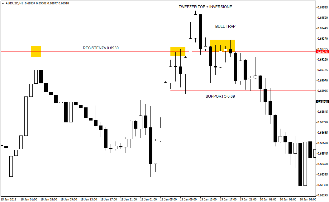 Il grafico mostrato oggi è riferito al tasso di cambio AUD/USD, il cosiddetto “Aussie” per i forex trader. Il time frame di osservazione è il 60 minuti, adatto per lo più a un’operatività di day-trading. Il pattern formatosi sul chart in basso è la tipica “Trappola degli Specialisti”, ovvero un’ampia configurazione basata sul falso breakout. La presenza di un tweezer top e di un doppio massimo lower low è il primo indizio che il trend rialzista sia maturo per l’inversione.