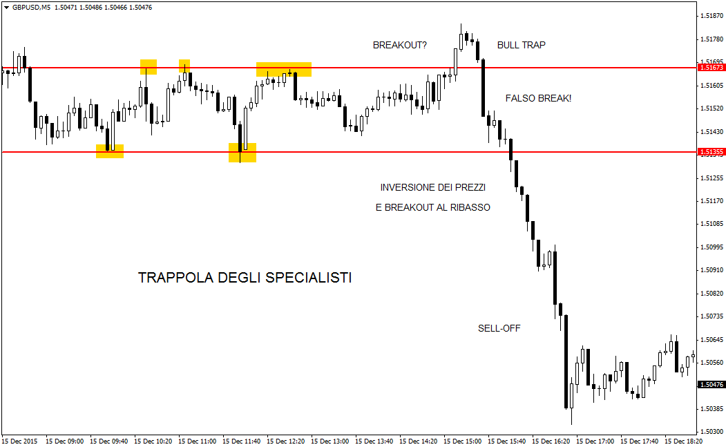 I “sell” iniziano a prevalere con decisione, pochi minuti dopo l’avvenuto breakout. I prezzi rientrano all’interno della congestione, costringendo gli scalper a chiudere velocemente le proprie posizioni impostate al rialzo. E’ un netto falso breakout, in questo caso una bull trap. La caduta della quotazione sotto il supporto del rettangolo innesca un pesante sell-off, che porterà il Cable a perdere altri 100 pip nel giro di un’ora.