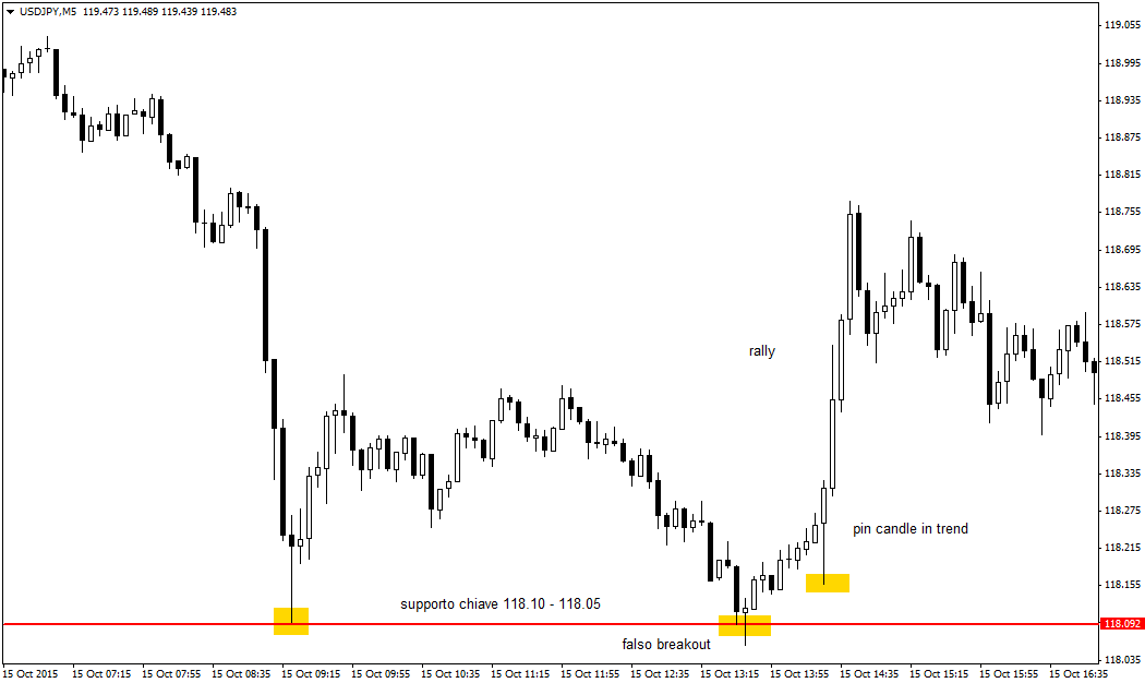Il caso di studio mostrato in alto sul tasso di cambio USD/JPY, time frame a 5 minuti, si può notare la presenza di più candele pinocchio, che vanno a identificare una zona di supporto chiave per il mercato intraday. Il primo segnale long vero e proprio scatta a seguito del fallimento del breakout dei bottom (“bear trap”), ma poco dopo viene confermato con la comparsa di una nuova netta pin candle che va a rafforzare lo scenario del trend rialzista emergente.