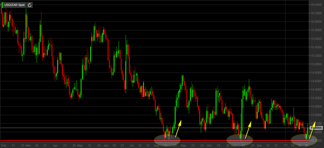 Il triplo minimo formatosi nel cambio USD/ZAR evidenzia l’importanza del livello di supporto dei prezzi. Come agire in prossimità di una conformazione di prezzo così rara?