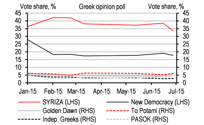 Syriza rimane ancora popolare rispetto alle alternative. Dopo aver ottenuto il 27,8% dei voti nelle elezioni del mese di gennaio, il partito di centro-destra Nuova Democrazia ora è regolarmente nei sondaggi sempre al di sotto del 20%.