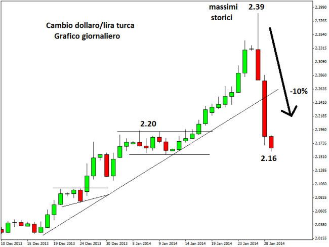 Sul forex il tasso di cambio USD/TRY è sceso fino a 2,16 ai minimi da oltre due settimane. Il cambio era salito su livelli record a 2,39 circa, ma da questo massimo storico è avvenuta una discesa superiore al 10% in appena tre sedute. Tuttavia negli ultimi mesi la lira turca si era svalutata tantissimo, tanto che la banca centrale di Ankara era dovuta intervenire sui mercati utilizzando le sue preziose riserve in valuta estera.