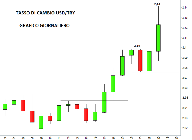 La fuoriuscita di capitali stranieri è ben visibile sui mercati valutari, dove la lira turca sta crollando pericolosamente nonostante gli interventi della banca centrale di Ankara. Sul forex il tasso di cambio USD/TRY ha aggiornato i massimi storici, salendo fino a 2,14 nel giorno di Santo Stefano. Da inizio anno la lira perde circa il 20% sul dollaro americano. La situazione non va molto meglio se il rapporto di cambio include l’euro. Infatti, il cross EUR/TRY si è spinto fino a poco sotto 2,93, ai massimi di sempre: da inizio anno questo tasso di cambio sta guadagnando il 25%.