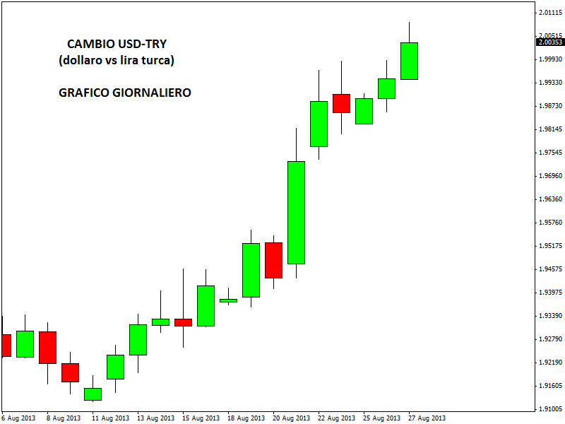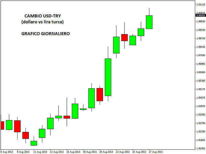 Stanotte sui mercati asiatici il tasso di cambio USD-TRY ha toccato il livello più alto dal 1981 sopra quota 2. Il top intraday è attualmente pari a 2,0089. Non si ferma nemmeno la corsa al rialzo del cross EUR-TRY, che è salito fino a 2,6870. Il rendimento dei bond biennali di Ankara è balzato sui livelli più alti da gennaio 2012, superando addirittura il 10%. Il rischio-paese è in costante aumento.