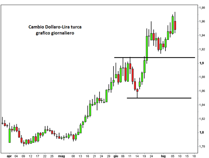 Sul forex la lira turca è in caduta libera sul dollaro americano, anche se da ieri è iniziata una correzione tecnica. Il tasso di cambio USD-TRY è salito fino a 1,974, sui livelli più alti da oltre 4 anni. Da inizio maggio il cross dollaro-lira turca ha guadagnato già l’8,5%. A inizio anno la quotazione era pari a 1,785 circa. Il cambio EUR-TRY, invece, resta stabile in area 2,505, ma lo scorso 20 giugno era salito fino a 2,5768 ai massimi da ottobre 2011. Da inizio maggio il cambio guadagna più del 6%.