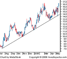 Come si evince dall’immagine accanto, la trendline viene disegnata in corrispondenza dei minimi del trend rialzista. La linea rappresenta in questo modo un livello di supporto ai prezzi che tendono a risalire ogni volta che scendendo incontrano la linea di trend. Solo per fare un esempio, la trendline può esserci d’aiuto nel voler stabilire in quale momento i prezzi smetteranno di scendere per riprendere la via del rialzo. Allo stesso modo funziona la linea di downtrend, disegnata in corrispondenza di massimi raggiunti dal titolo; la linea di trend ribassista funziona come un livello di resistenza.