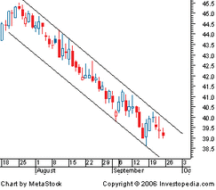 La figura accanto mostra un canale discendente; la trendline superiore è stata disegnata sui massimi, quella inferiore sui minimi. Come si vede, il prezzo del titolo rimbalza tra le due linee pur rimanendo all’interno di questo range per diversi mesi. Fino a quando non avviene una decisa rottura del canale, sia essa al rialzo oppure al ribasso, è prevista la continuazione di questa fase in cui il mercato è in fase di "range-bound".