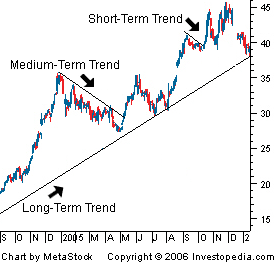 All’interno di un trend di lungo periodo troveremo diversi trend intermedi che possono anche muoversi in direzione opposta rispetto al trend di lungo periodo. Se il trend generale si muove al rialzo, ma è interrotto da una correzione dei prezzi al ribasso seguita poi da un nuovo movimento al rialzo, avremo allora un trend intermedio di correzione. I trend di breve periodo, infine, vengono considerati come componente principale dei trend a medio e lungo periodo; così come si evince dall’immagine accanto.