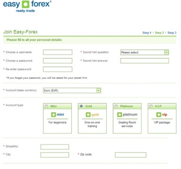 Nello step 2 devi scegliere username e password, domanda e risposta segreta (hint), valuta di base dell’account (seleziona EUR), tipo di account (ti consigliamo il Gold per cominciare), indirizzo e rispondere ad alcune domande.
