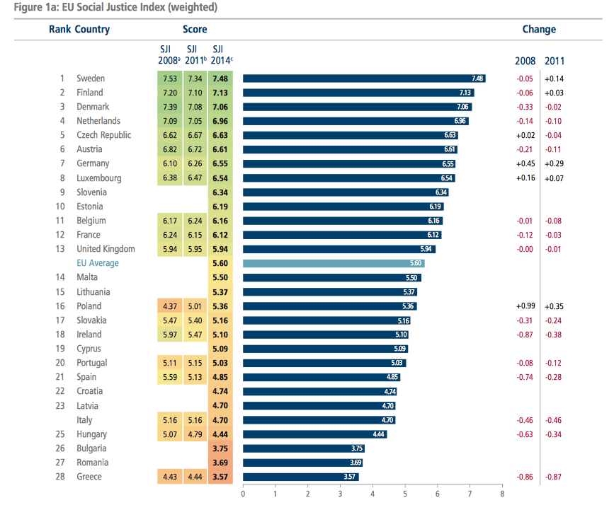 Nei paesi del nord si registra un alto livello di giustizia e inclusione sociale: nessun cittadino è lasciato da solo, ma tutti sono accompagnati dalla scuola alla pensione, passando per il mondo del lavoro con aiuti e incentivi. I paesi del sud invece, hanno registrato miglioramenti per quanto riguarda l’economia, più stabile oggi rispetto al 2011, ma a fronte di un sensibile peggioramento delle condizioni sociali dei cittadini. Infine, secondo il think tank tedesco tra il 2007 e il 2013 Germania, la Polonia e Lussemburgo sono rimasti stabili con un buon livello di giustizia sociale.
