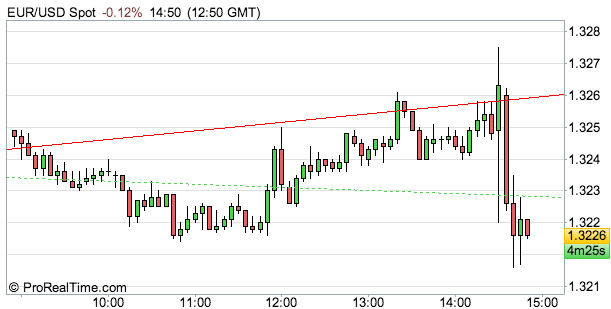 Pochi minuti prima della pubblicazione, il cambio Euro/Dollaro è sceso ad un minimo di 1.3231 per poi riprendere con una lunga candela rialzista e arrivare nel giro di pochi minuti a 1.3275.