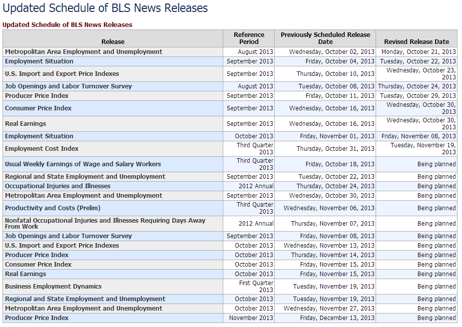 Il calendario delle pubblicazioni dal Bureau of Labor Statistics statunitense, rimandate a causa dello shutdown.
