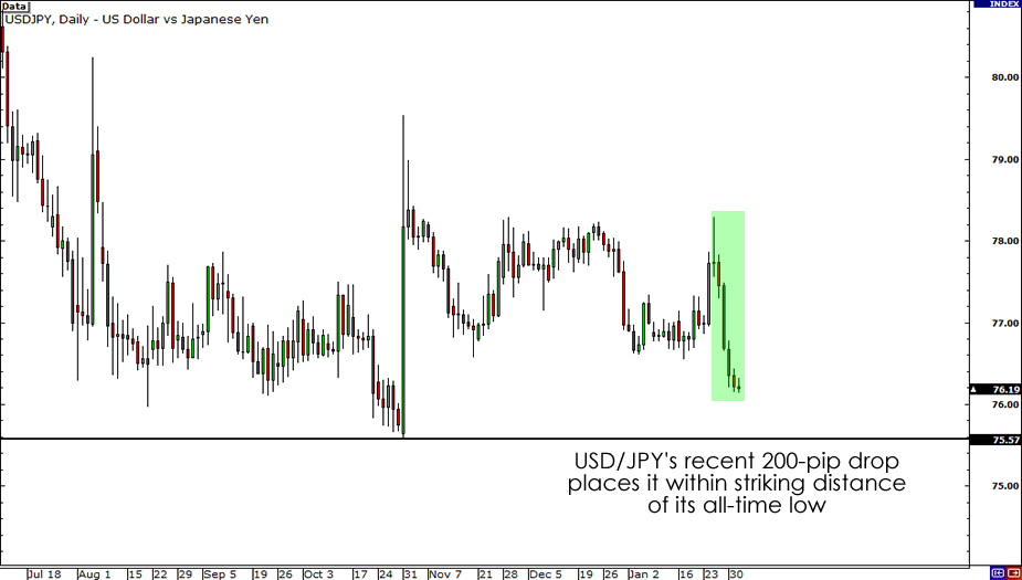 Il cambio dello yen con il dollaro è l’unità di misura che la Banca del Giappone utilizza per misurare la forza della valuta nazionale. Ebbene, il cambio è caduto di circa 200 pip nel giro di una settimana. Un comportamento piuttosto strano per questa coppia, che ora si trova sotto il livello dei 76.50, il più alto dall’ottobre 2011.