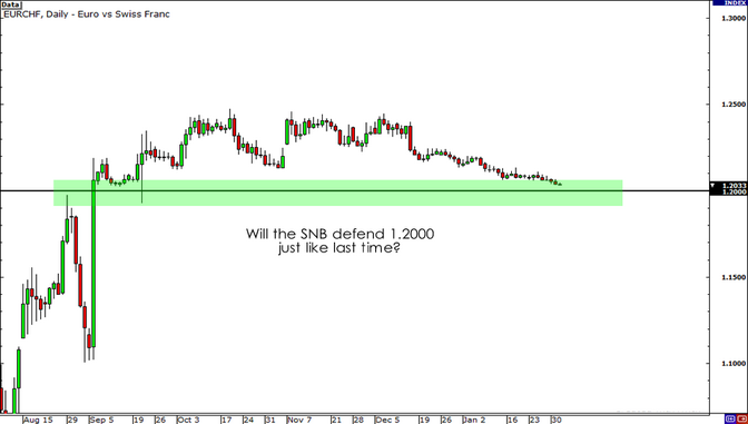 La Banca Nazionale Svizzera sta subendo pressioni simili alla banca centrale giapponese. Uno sguardo veloce al grafico del cambio EUR/CHF rivela che la coppia va avvicinandosi perisolosamente verso la soglia di 1.2000 - il tetto che la la banca centrale svizzera aveva preventivamente stabilito per il cambio.